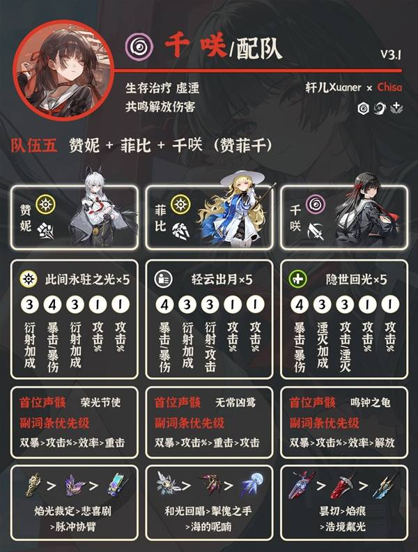 ⑤赞妮+菲比+千咲:赞菲优先搭配衍射主/守岸人这些,如果实在不行再考虑千咲。