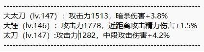 主测大太刀,同时测了太刀和大锤的部分武技作为参照。三把武器都是一周目通关时boss掉落的绿装,爱用度均为0。虽然不能保证完全公平,但至少能反映同期掉落装备之间的差异。三把武器的性能和伤害词条如下图。词条基本不影响测试,所以就不花资源洗了。