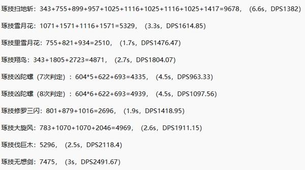然后是琢技状态下的数据。这次没测雪月花缩,但多测了扫地斩和凶陀螺。这两种武技琢技发动时可以不考虑精力限制,但攻击次数有上限(扫地斩扫9次,凶陀螺转7圈)。测试中凶陀螺有时出7次伤害判定,有时8次,两种情况都记录下来。