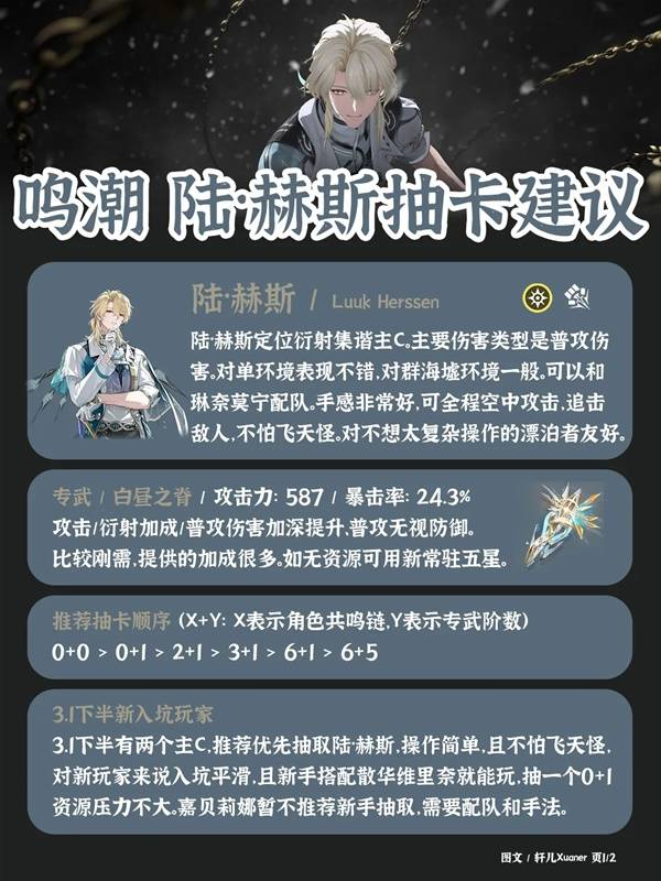 陆·赫斯定位衍射集谐主C。主要伤害类型是普攻伤害。对单环境表现不错,对群海墟环境一般。可以和琳奈莫宁配队。手感非常好,可全程空中攻击,追击敌人,不怕飞天怪。对不想太复杂操作的漂泊者友好。专武提供攻击/衍射加成/普攻伤害加深提升、普攻无视防御。比较刚需,提供的加成很多。如无资源可用新常驻五星。