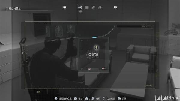 库房北侧通道直走来到入口,向右上楼梯,再向右进入会客室,室内资源如地图所示。在会客室的两侧墙壁,调查墙壁上的3个电子屏幕,获得【文件67:浣熊市生物武器研究报告】、【文件68:产品目录1(2026年版)】、【文件69:产品目录2(2026年版)】。