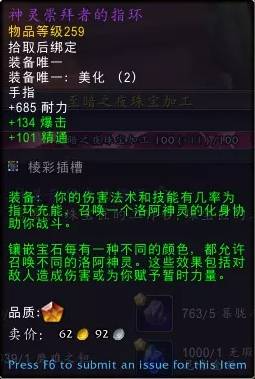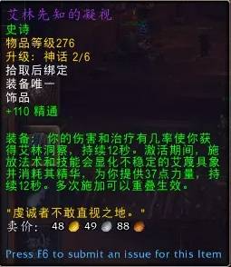目前最推荐的饰品组合为圣光连队的旌旗+艾林先知的凝视,旌旗为我们补足了关键的爆发期急速,说是构筑核心饰品也不为过;艾林则是有着夸张的覆盖率和叠加效率,数值爆炸。