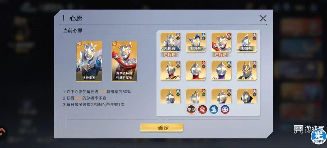 日冕赛罗是必须要培养的,灼烧队打伤害的核心角色,心愿选择他也可以快速帮他升星。