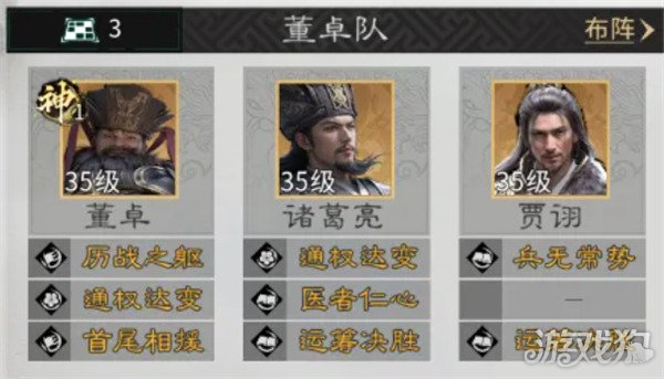 诸葛亮追击技建议更换为“运筹决胜”,其机制为每次承伤提升4%伤害,叠满10层后总增益达40%,显著放大中后期输出压力。配合贾诩“纵傀”的混乱连锁与董卓“独断专权”的群体压制,整套阵容在前3回合即可建立绝对控制优势,战斗节奏完全由我方主导,敌方关键技能几乎无法顺利释放。