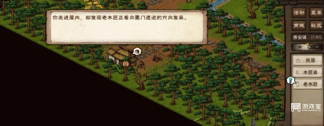 4、【泰安镇】4.对话老木匠(7,40)触发剧情,然后在(7,39)对话老木匠。