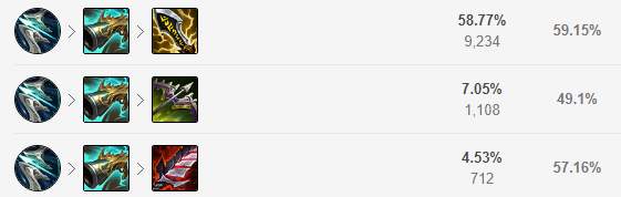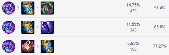 岩雀的一套技能消耗对手不少血量能够完美触发黑暗收割,恶意中伤搭配岩突,可以造成更多的伤害。贪欲猎手可以增加岩雀的续航和生命回复能力。巫术中的灵光披风在使用召唤师技能后移速更快,水上行走让她在河道移动更快。