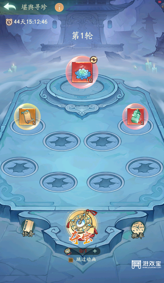 玩法技巧:格子夺宝模式,可刷新奖励;兑换优先级「洛阳铲>橙/紫法宝>基础材料」,切勿本末倒置,浪费罗盘