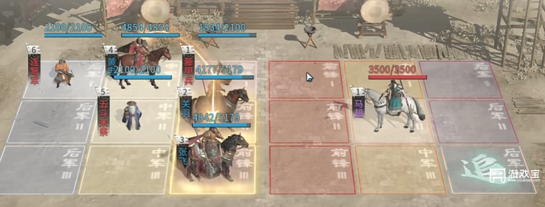 1、第一关是名将马超,我们用黄忠、关羽、张飞,技能如下:
