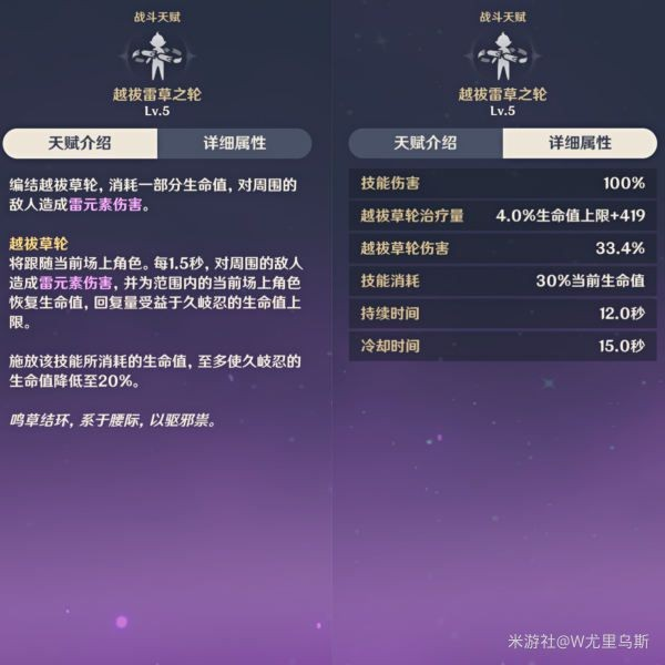 消耗30%生命值开启技能,每1.5秒奶一次。挂一次雷。回血奶量受益于久岐忍的生命值和元素精通(固有天赋)。技能消耗生命值,至多降低到20%。