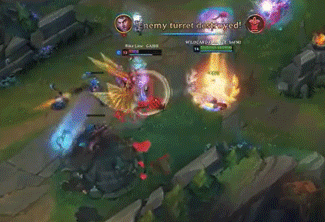 团战:正常发育到游戏中期,利用好多段E技能的加速到队友附近,再使用减速装备留下落单的敌人,使用远距离炸弹控制让队友补充伤害造成击杀。进入团战的减速场配合炸弹则令敌方无法站出完美阵型。使用Q隔绝敌方的前后排,或是对贴近输出的敌方核心使用双炸弹晕眩。释放E减速切入的敌方刺客和给队友加速效果调整输出位置,再开启W减少CD重复使用QE。R技能不仅只用来保护己方脆皮,在对己方即将倒下的高血量前排时效果同样出色。
