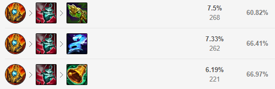 当前版本还是出海妖的赛娜居多。快速打出三下普攻,配合羊刀,有不错的真实伤害输出。当然还有一种霜火冰拳流赛娜,坦度更高,粘人能力更强,也非常火热。