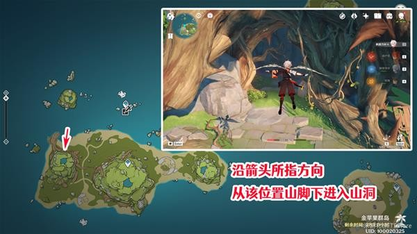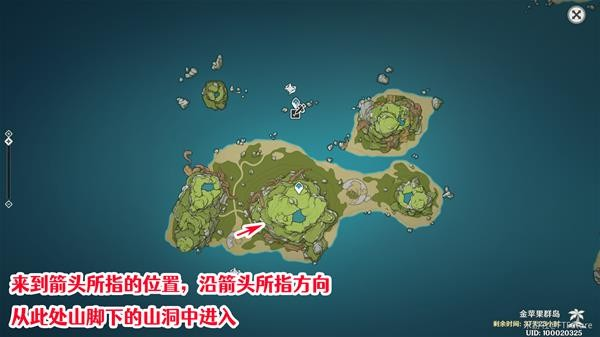 切换好之后,来到下图箭头所示的位置,沿箭头所指的方向,从这里山脚下的山洞进入。