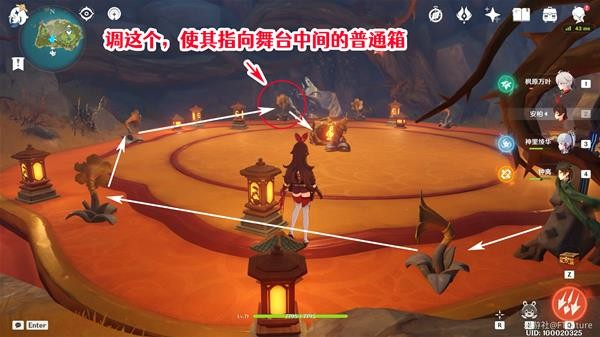 拿完海螺,我们继续完成这里的解谜,来获得尘歌壶摆设。首先站在演奏机关左边,调整红圈所示的花朵,使其指向宝箱,之后演奏即可解锁这个普通的宝箱。(白色箭头即为最后演奏时的传导路径)