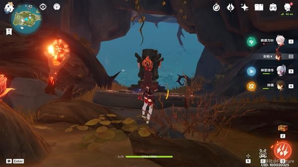 返回后回到刚才的火元素方碑旁,这时我们已经点亮了4个火炬(水边1个,方碑旁1个,道路左侧1个,门扉机关里1个),火元素方碑已经没有封印了,这时将火元素方碑点亮,水位会再次下降。