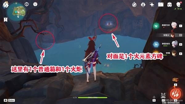 水位下降后,走近水边往里看,左手边远处的墙根下有1个普通箱和1个火炬,对面有1个同样封印着的火元素方碑。