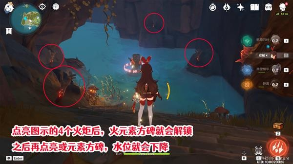 进去之后往里走,可以看到这边有4个火炬机关,和1个封印着的火元素方碑。点燃4个火炬后,火元素方碑就会解除封印,再点亮火元素方碑,水位就会下降。