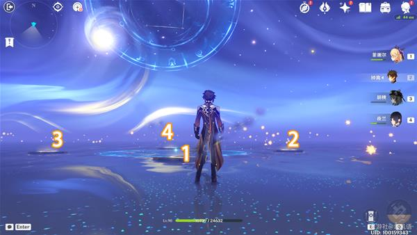 12.来到幻境中,需要拼一个莫娜的命之座,在初始状态下,如下图,按顺序1234,各踩一篇即可完成(如果踩乱了,退出秘境重进,就重置了),出现传送门。