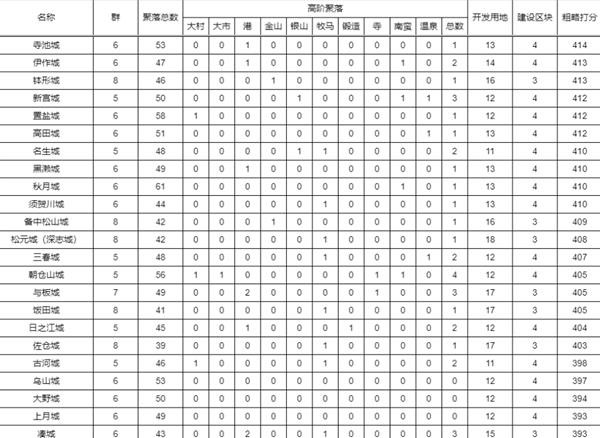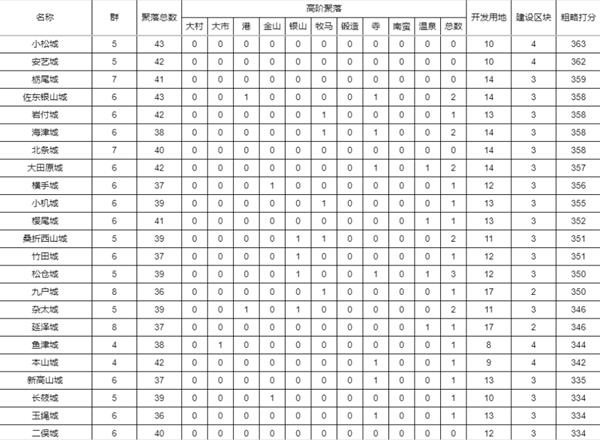 之后就是大家都在诟病的大阪城,居然只有4郡。但是大阪的4郡质量非常高,而且大阪有7个高阶聚落,城下建设空地也有7个,总分排名能到13名,实在是不算差的城了。