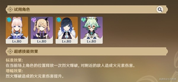 标准效果:在当前场上角色的位置释放一次烈火爆破, 对附近的敌人造成火元素伤害。