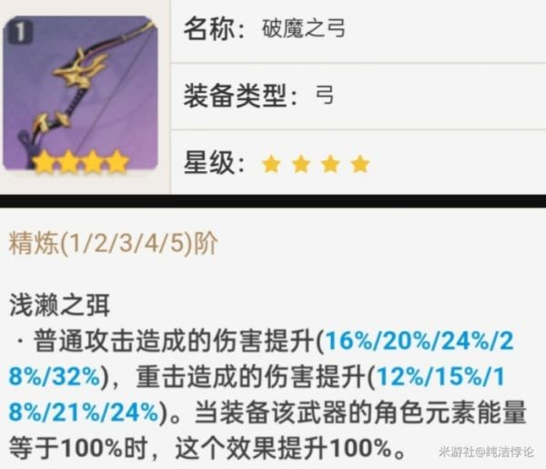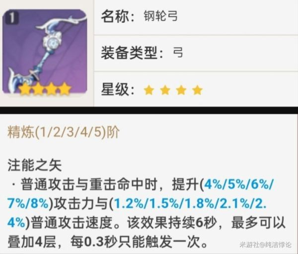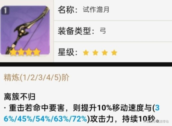buff需要命中要害才能触发,buff收益较高,移动速度增加可以提供一定的走射环境。人形怪物的要害一般是头部,机械形怪物的要害一般是核心。主属性增加攻击力。虽然后期攻击力收益稀释严重,但奈何它给的实在太多了。适合甘雨、安柏、提纳里等蓄力弓箭角色。可锻造与精炼。