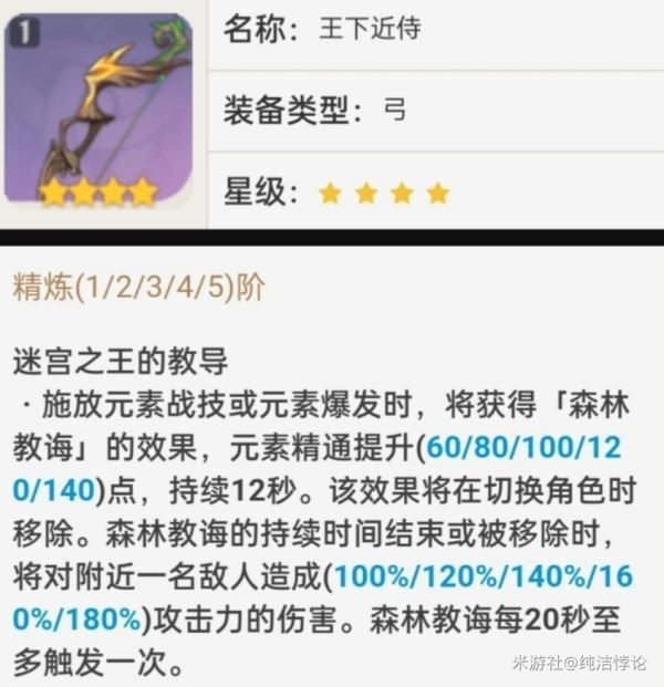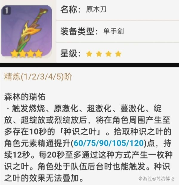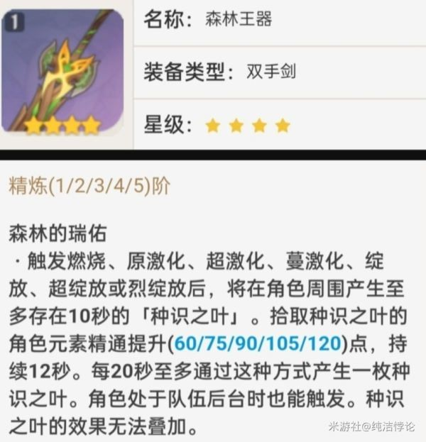 具有较高的攻击力,触发草元素相关元素反应后,还能为输出角色提供攻击力buff。强度较高,但适用范围狭窄。适合香菱、烈绽放流托马。可锻造与精炼。