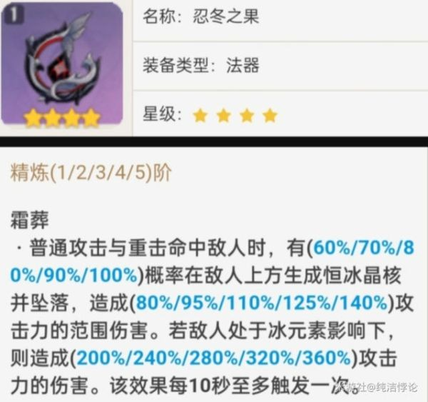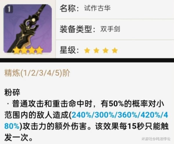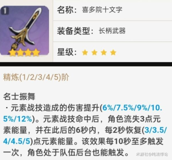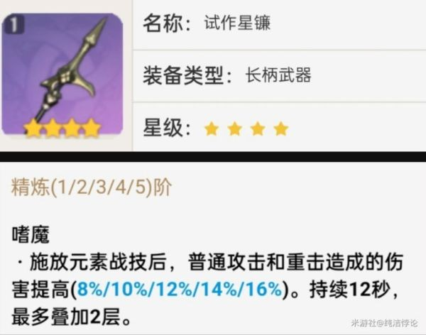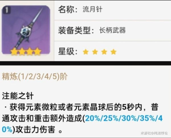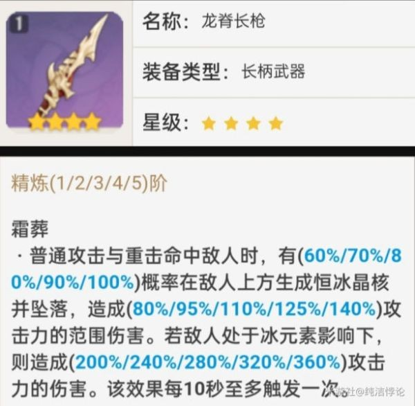获得元素微粒或晶球的时候就可以增加普攻和重击伤害。主属性增加物理伤害,与目前主流长柄武器输出角色的输出方式相违背。适合物理流罗莎莉亚和物理流钟离。可锻造与精炼。