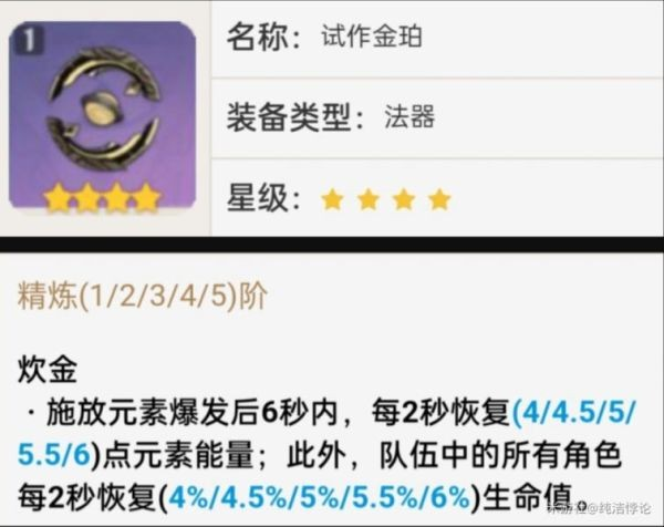在施放元素爆发后触发全队回血并给自身回能量。主属性增加基础生命值。适合芭芭拉、珊瑚宫心海。高精炼情况下也适用于莫娜、砂糖、盾辅流烟绯等辅助角色。推荐锻造与精炼。