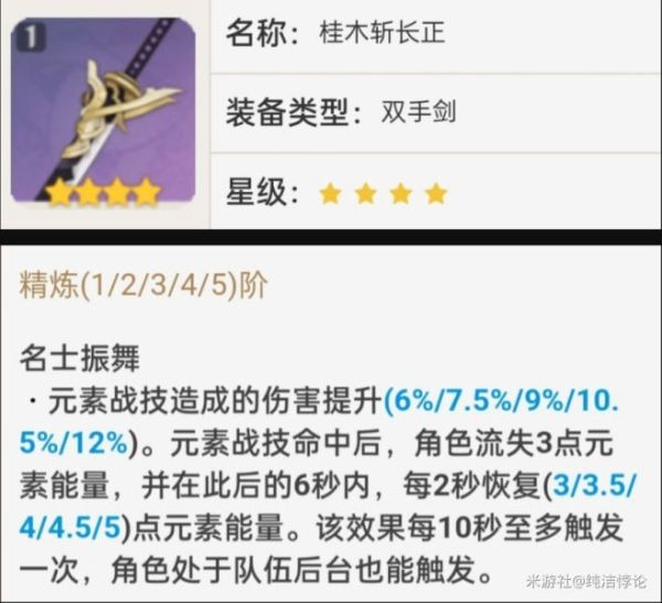 非常不错的充能大剑。相较于同为充能大剑的西风大剑与祭礼大剑来说,桂木斩长正的充能效果稍差一点,但输出能力偏高一些。适合副c北斗、副c重云。可锻造与精炼。