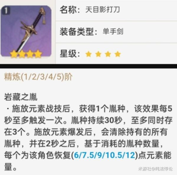 攻击力面板较高,具备一定的元素充能效率。触发草元素相关元素反应后,还能为输出角色提供元素精通buff。强度较高,但适用范围狭窄。适合班尼特、草元素主角。可锻造与精炼。