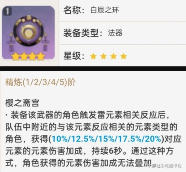 攻击力面板较高,元素充能效率较低,武器技能偏向于辅助。适合辅助流丽莎、辅助流莫娜、辅助流芭芭拉、武装流珊瑚宫心海、武装流砂糖、武装流八重神子。白辰之环想要发挥出明显的作用对精炼的要求很高。可锻造与精炼。