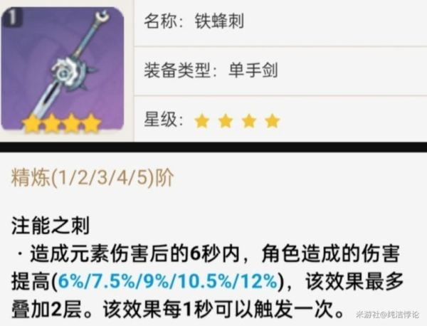 造成元素伤害时就可叠加buff层数,并且只有2层,叠加很便利,满精炼的情况下最多可以增加角色24%的伤害,buff收益尚可。主属性增加元素精通,同样是不错的属性。适合风元素主角、枫原万叶和久岐忍。可锻造,不推荐精炼。