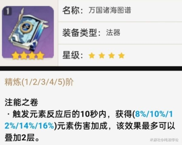 buff虽然需要元素反应触发,但直接增加元素伤害,满精炼后增加32%元素伤害,收益较高。主属性增加元素精通,较为实用,可惜加成数值较低。攻击力面板是4星法器中的佼佼者。总的来说是一件不错的输出用过渡法器,适合可莉、鹿野苑平藏、烟绯、丽莎、八重神子。推荐锻造与精炼。