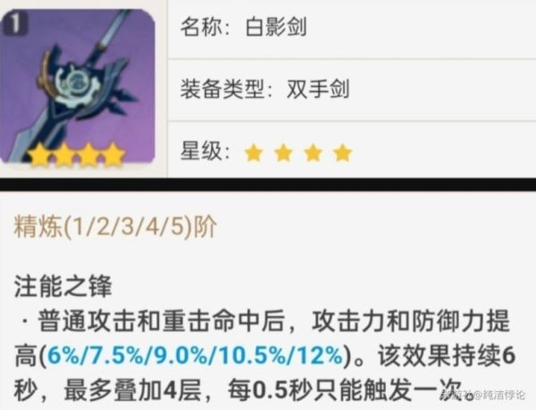 *幅提高角色防御力。对于想要使用输出流诺艾尔、荒泷一斗、辅助流辛焱的玩家来说,白影剑是非常不错的过渡武器。可锻造与精炼。