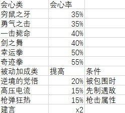 会心加成差不多这些,还有些主动技能没有具体值就暂时搁置了,有具体值的大佬可以顺手补充,总之会心上限67%的情况下,像一击这种就不需要建言+枪弹狂热,直接建言就满了,而至高魔弹这种则是多多益善。