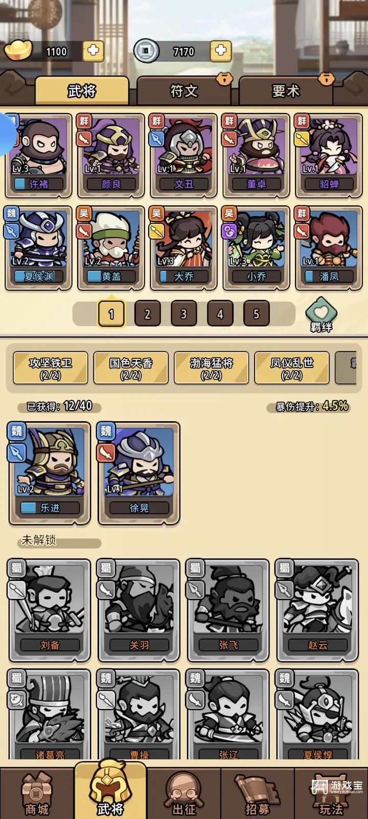 开局就围着这“铁三角”组建阵容,非常扎实。然后可以搭配大小乔、貂蝉、董卓这些容易获得的武将凑羁绊。有抽奖券就抽,这游戏金卡爆率还挺良心的!