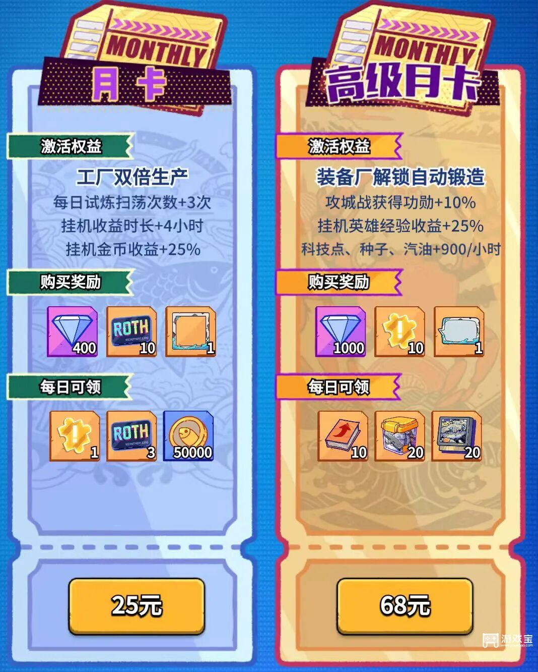 ③ 普通月卡权益(25元):每日试炼扫荡次数+3就很夸张了,要知道VIP11的扫荡次数也只能+2,有三个试炼副本,就是每日多9次扫荡;前中期金币一直是极其稀缺,所以月卡挂机金币收益+25%和每日可领的5w金币都很有必要,挂机收益时长+4小时和累计100张招募卡,虽然与前面的比起来显得无足轻重了,却更彰显了月卡T0性价比的地位,最重要是开启第二生产位同时生产(极大提升生产效率)。