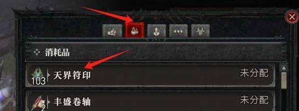 首先用打开【动作轮盘】(按E键),在消耗品这栏找到【天界符印】,之后左键点击拉到轮盘随便个空位置上,这就设置完成。