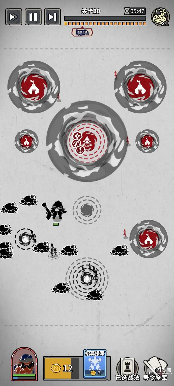 9、图中拿下中路3级兵营,会成为敌方集火点。所以防御中心转移到3级兵营。防御没问题的话就拿下左右两侧的2级兵营。这个关卡,前线兵力消耗比较高,老家我就没升4(感觉升4级消耗兵挺多的)(如果碰到那种只有老家苟到最后的关卡局面,肯定要提前升老家)