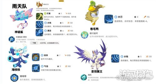 雨天队的配置主要是围绕精灵下雨效果。除了彩蝶鲨,卷毛鸭也成为主要的输出点。水刃在水系的环境中,威力直接翻倍,应对状态时,能耗就可以减4,配合雨天buff就可以直接造成炸裂的伤害。圣羽翼王虽然是异系,但可以学水系技能水泡。主要的特性就是飓风,还是比较适合这一套阵容。其他的精灵在放完相同技能之后,就可以获得迅捷。更换宠物入场时就能释放符合能量要求的技能,收割残血的效率还是比较高的。然后搭配润泽技能,可以提升魔法攻击,整套阵容简单粗暴,靠着高爆发就能打出伤害,不过缺点是容错率相对比较低。