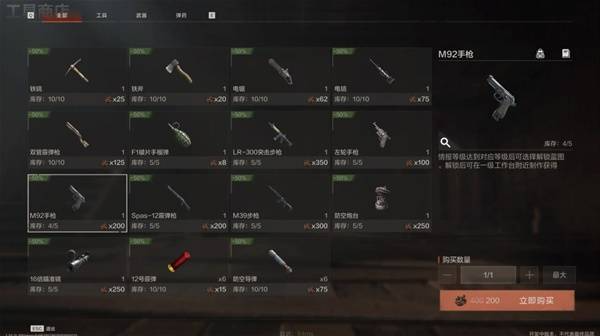 最后打开武器商店,在武器栏找到M92手枪,消耗400废料直接购买,全程约10分钟就能拿到枪械,之后就可以反击其他未获取枪械的玩家。