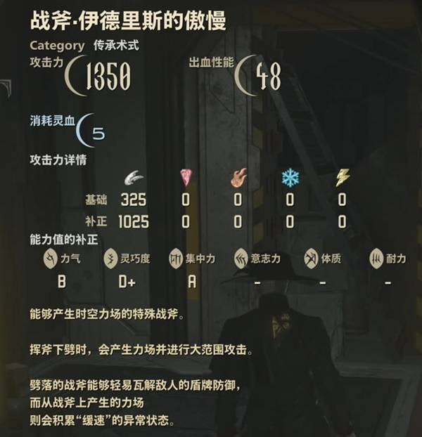 前期没得选,“战斧·伊德里斯的傲慢”是最适配的选择,效果是召唤一个斧头砸到地面形成一个范围立场,在立场范围内的敌人受到伤害且叠加“缓速”效果。