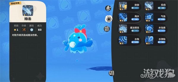 3号技能推荐“水光冲击”,作为稳定输出手段,可对单体目标造成140点魔法伤害; 4号技能可在“魔能爆”与“当头棒喝”之间择一装配:“魔能爆”的伤害随自身魔力消耗量提升而增强;“当头棒喝”则在切换出场精灵时自动触发,对当前目标施加一次高额固定伤害。