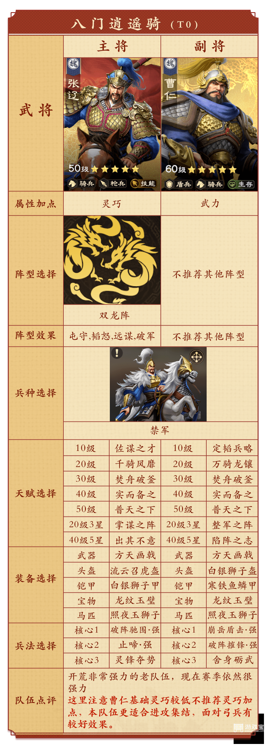 比较强力的技能体系开荒队伍,其中曹仁可换为为赵云或吕布。攻打时需选择克制的盾兵;