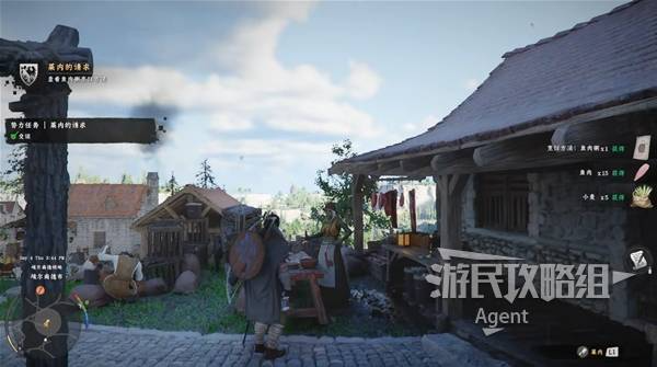 在告示板查看告示,接到势力任务“莱内的请求”,然后到肉铺找菜内对话,获得鱼肉粥的烹饪配方。