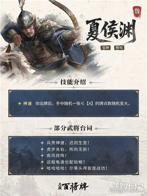 三国百将牌中众多知名将士都将化身为游戏角色与玩家在牌桌上进行对战,夏侯渊是魏阵营的角色,通过神速,让玩家的手牌点数快速变大,一些小伙伴想要知道三国百将牌夏侯渊怎么玩,今天小怼将给玩家们带来关于夏侯渊实战操作技巧解析。