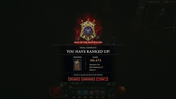 而在每周试炼场重置时,则会依照你的最高分数给予试炼之箱。当周获得的分数越高,宝箱的奖励也越好。试炼之箱保证包含一个远古传奇物品,其物品等级会依据所获得的宝箱阶级而订。获得英杰徽印则会给予最令人称羡的宝箱,保证掉落 925 物品强度的物品。