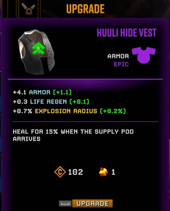 每件装备可在升级界面进一步强化。如果你对某一件装备情有独钟(没错就是你,在击杀精英后提供两秒+200%拾取范围加成的狩猎胸甲),你可以用你挣来的代币和矿石材料为其升级。装备的等级和稀有度越高,升级所需费用则越高,同时同一件装备可被升级三次。