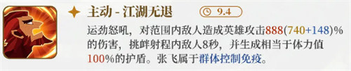 运劲怒吼,对范围内敌人造成英雄攻击888(740+148)%的伤害,挑衅射程内敌人8秒,并生成相当于体力值100%的护盾。张飞属于群体控制免疫。