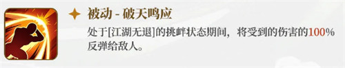 处于[江湖无退]的挑衅状态期间,将受到的伤害的100%反弹给敌人。