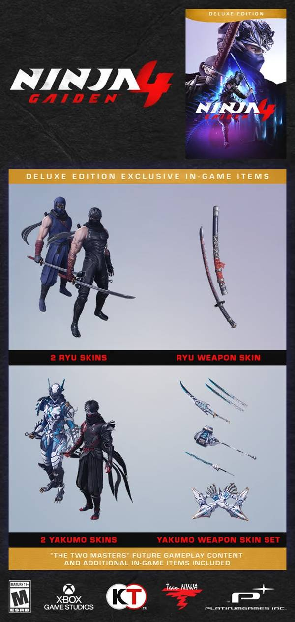 《忍者龙剑传4》已经开启了预购,并且拥有两个版本,分别是标准版和豪华版。下面为大家带来《忍者龙剑传4》预购及豪华版奖励一览,一起来看看吧。